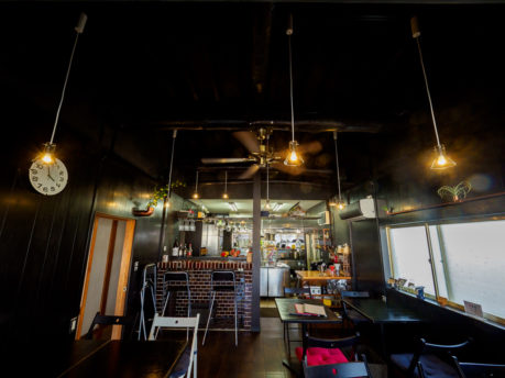 店に入り、天井を見上げると、黒光りする太い梁がデーンと交差していて「なるほど古民家」という感じだが、それ以外は、むしろ現代的で洒落たカフェだ。水道管らしきものを壁に取り付けて、その両端の穴にエアプランツを活けているのも面白いし、照明や壁掛け時計もいちいち格好いい。客席は、暖炉をリノベーションしたカウンターが二席に、二人がけのテーブルが六卓と、サイズ感もちょうど「隠れ家」的である。