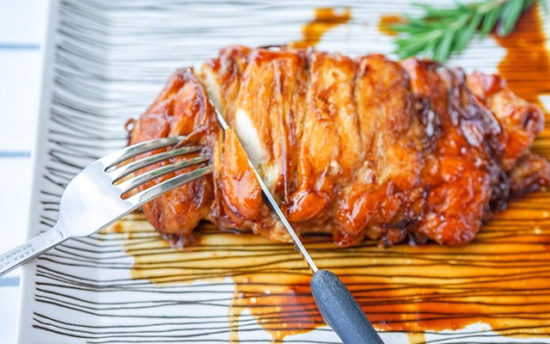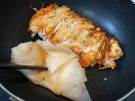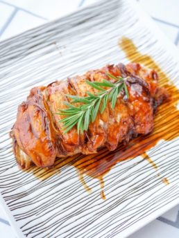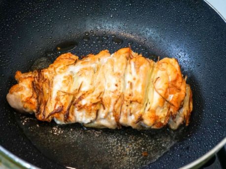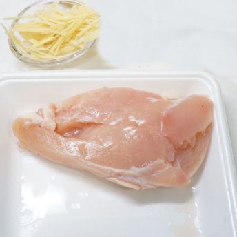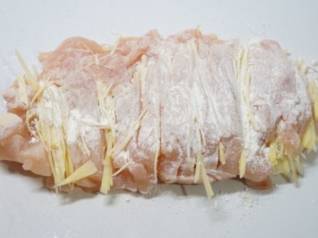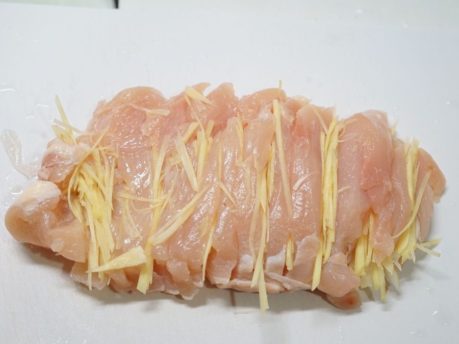 ハッセルバックポテトのように、むね肉に切り目を入れて、間にしょうがを挟んでいるので、しょうがのシャキシャキ食感とちょこっとピリッとした辛味がおいしい♪