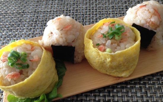 丸や三角ににぎって、薄焼き卵やのりで巻いたり、万能ねぎや白ごまをトッピングしたり。