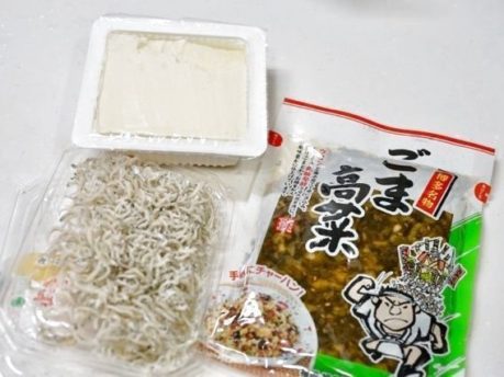 スーパーで買える「ごま高菜」と「ちりめんじゃこ」を炒めて食感も味も抜群のおうち居酒屋にピッタリの冷ややっこを考えてみました。
