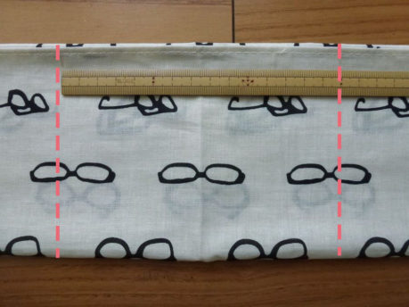 中央から7.5㎝のところを二カ所(赤い点線)、まっすぐにミシンで縫います。これで保冷剤の入るポケットができます。