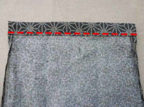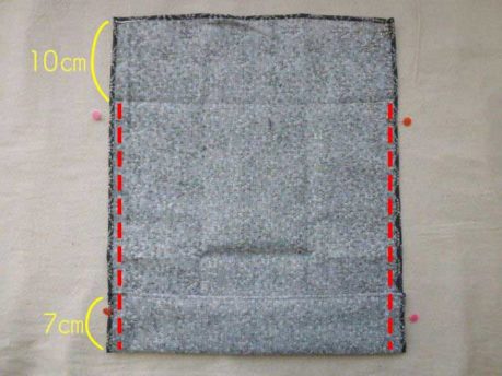 てぬぐいの表面を内側に合わせて半分に折り、輪になっているほうを下から7㎝(マチ、好みの長さで)折り上げます。待ち針でとめ、両脇をミシンで縫います。※このとき、ひもの通し口を作るため、上から10㎝は縫いません。