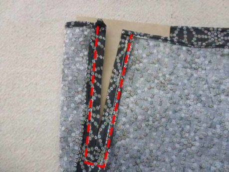 縫わずに残したひも通し部分10㎝の縫い代を左右に折り、ミシンでコの字(赤い点線)に縫います。両側、縫います。