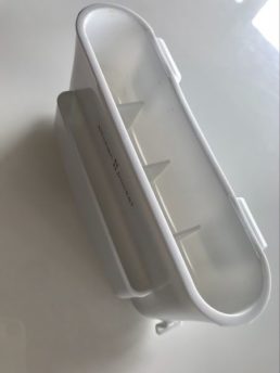 後ろがフック状になっているので、仕切りの箱に引っかけてみました。