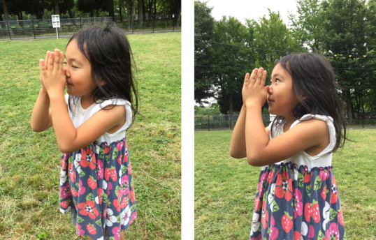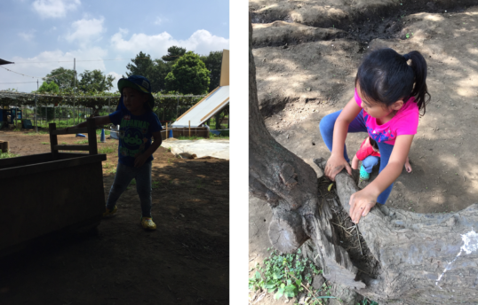 日影の子どもを撮るとどうしても暗い写真になってしまうと思ってませんか?太陽がさんさんと照りつけているのような日中の場合、青空を背景に撮影しようとするとスマホカメラの自動補正機能により、下のように人物が真っ暗な写真になってしまうことがあります。そんなときは、撮影者も日陰に入って、背景も日陰にすれば風景も人物も明るい写真になります。