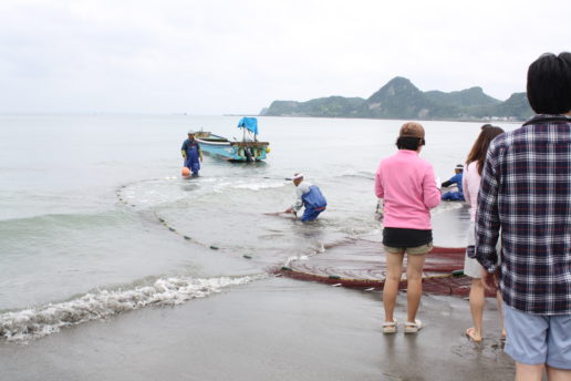 二手に分かれて地引網を力いっぱいひっぱります。さて、どんなお魚が獲れるかな? 気になる網の中身は……。後編でお伝えします!