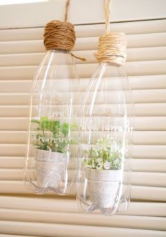ペットボトルはとがるとケガをしやすいので、カッターナイフを取り扱うときやグリーンを入れるときには十分お気をつけください。応用が利くのでひもの色を変えてフェイクフラワーでもいいですし、小物などを飾ってコレクションケースにするなどいろいろ楽しめます。ぜひお試しください。