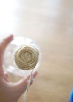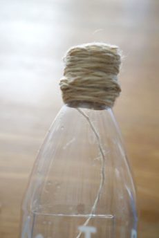 キャップ部分には工作用のボンドを塗り、ひもをグルグル巻いて貼りつけていきます。