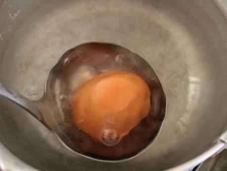 沸騰した鍋に卵をお玉にのせてそっと入れ、弱めの中火で7分30秒ゆでます。