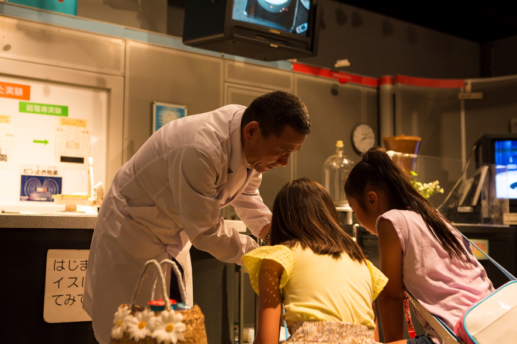 テーマごとに3つのフロアに分かれている現代産業科学館。2つめのフロア「先端技術への招待」で人気なのは、実験カウンターと実験シアター。いずれも手をのばせば届きそうな距離感で、さまざまな実験が繰り広げられます。取材当日も「すごーい!」「どうして?」と小学生の歓声があがっていました。