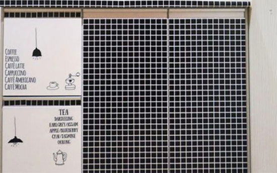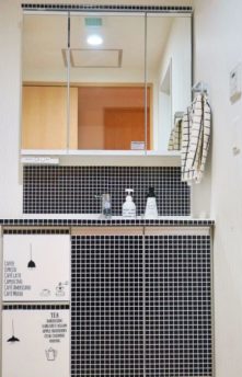 こちらのタイル柄は近づいても安っぽく見えないのがうれしいです。黒が入っているのに清潔な雰囲気で、細かい汚れが目立たないので、古くなった洗面台にもおすすめの素材です。
