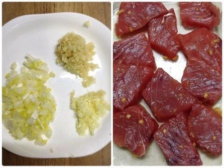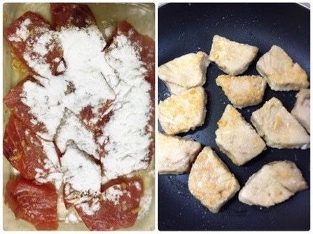 ①のまぐろに片栗粉をまぶし、サラダ油で焼き目をつけて火を通し、お皿に盛りつけておきます(油が気になる場合は一度キッチンペーパーにとると油がきれますが、わが家はしませんでした)。