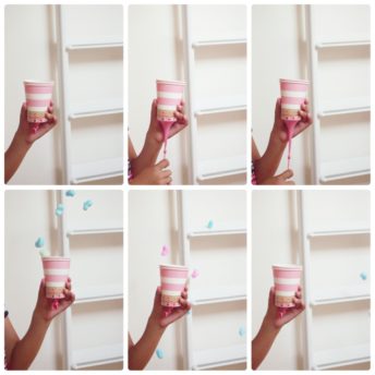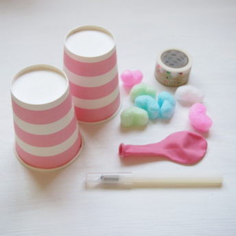 紙コップを2個重ねるのは、風船をかぶせるときに1個だとつぶれてしまうので耐久性をもたせるためです。