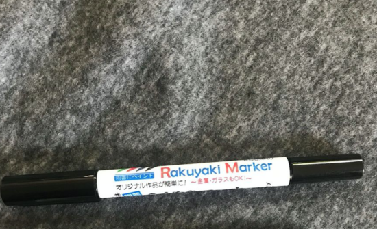 今回使ったらくやきマーカーは陶器工房らくやき ツインペンの黒。細かい文字は細いほうで、塗りつぶすときには太い筆先を使うと上手に描けます。