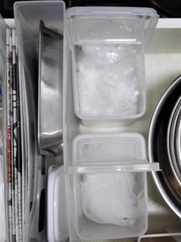 重ねて収納できるので深い引き出しを無駄なく使えます。布巾の漂白用ケースは使わないときは重ねてしまっておきます。使うときだけ取り出して……。