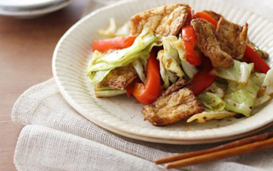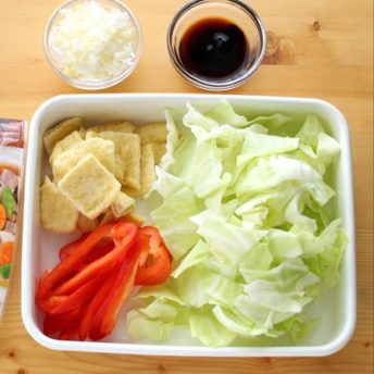 ①油あげは油ぬきし、8等分(長いほうを4等分、短いほうを2等分)に切る。パプリカは8㎜幅、キャベツは3㎝角に切る。