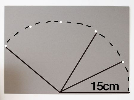 厚紙に定規とコンパス、分度器、ペンを使って扇形を書きます。だいたい150度ほどあればOKです。厚紙の大きさは目安です(見本はA4の厚紙に半径15㎝で書きました)。