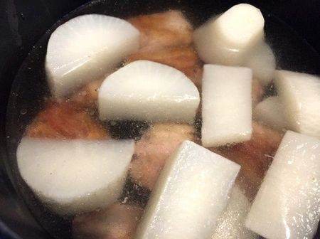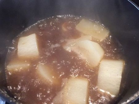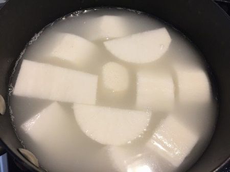 ①大根は3~4㎝の厚さの輪切りにしてから半分に切り、箸がすっと刺さるぐらいまで米のとぎ汁でゆでます。