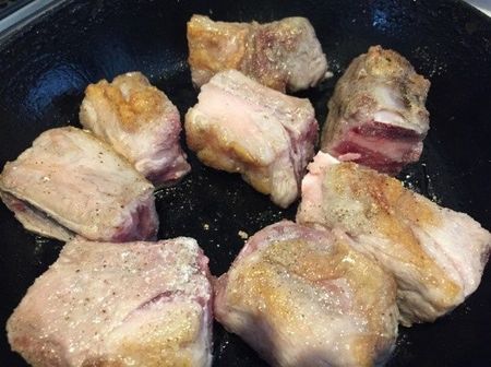 ②スペアリブに塩、こしょう、小麦粉をまぶし、フライパンで全体をこんがりと焼きます。