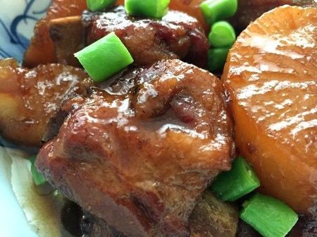 大根とスペアリブのこっくり煮です。てりてりの甘辛いしょうゆ味がしみこんでいるほっこり煮もの。時間はかかりますが、コトコトと煮込んでいく時間がなんだか楽しいです。こっくりと仕上げるには多めの日本酒、てりてりに仕上げるにはみりんがポイントです。白いごはんにピッタリ! おかわり必至!
