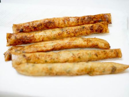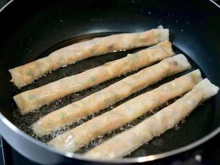 両面を揚げ焼きしていくと、だんだん春巻きがきつね色になり油の泡が小さくなってきますので、そのころが揚げ上がりの目安です。