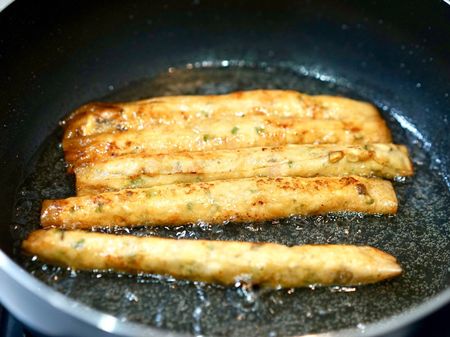 フライパンにサラダ油(分量外)を1㎝高さくらい入れます。中火にかけ油があたたまったら、片面ずつ揚げ焼きにします。焦げないように温度を微調整してください。