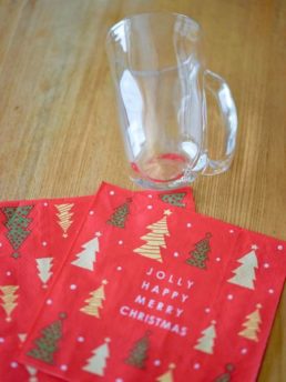 今回使用したグラスとペーパーナプキンです。グラスはビールを入れたりするジョッキ風グラス(高さが10㎝以上あれば立つと思います)。