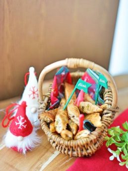 こちらはスティック春巻きを半分のサイズにして、ダイソーのピックをさしました(グリーンと赤のピックだけ使用)。器はナチュラルキッチンの持ち手つきのかごに、セリアのペーパーナプキンを敷いています。人数が多くなった時や、子どもたちには小さめにカットしたものがおすすめです。