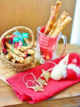 ちょっとしたことですが、イベントに合わせた盛りつけや色合いにすると、同じフィンガーフードでもグンと気分が上がります。手前に見える星も100円ショップのグッズで、ツリーなどの飾りに使うものですが、テーブルに添えても楽しいグッズになります。同じスティック春巻きでも、カットなしとカットしたもの高低差をつけて盛りつけてれば、ちょっと豪華に見えちゃうのでお試しください。