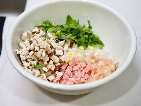春巻きの皮、ひき肉以外の具材はすべてみじん切りにしてください。しいたけは特に意識して細かめにしたほうが、皮に塗るときに塗りやすいと思います。軸はかたいので特に細かくしてください。