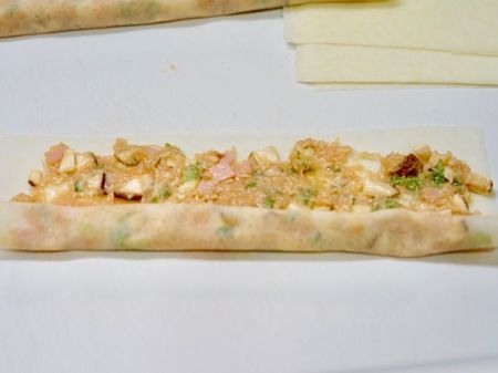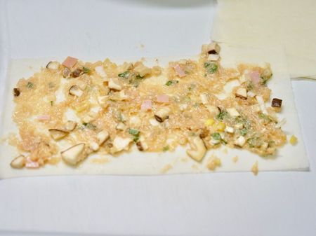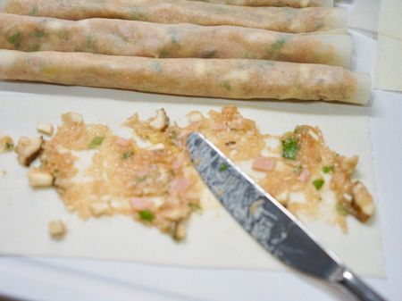 春巻きの皮全体に薄く②の肉だねを塗ってください。あらかじめ10等分くらいに分けてから塗れば、途中で足りなくなることもなく、太さもそろいます。バターナイフやディナー用のナイフを少し寝かせて塗ってください。