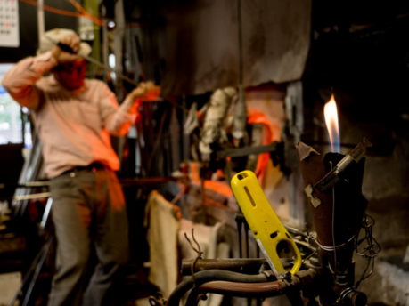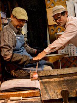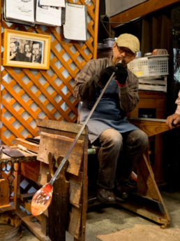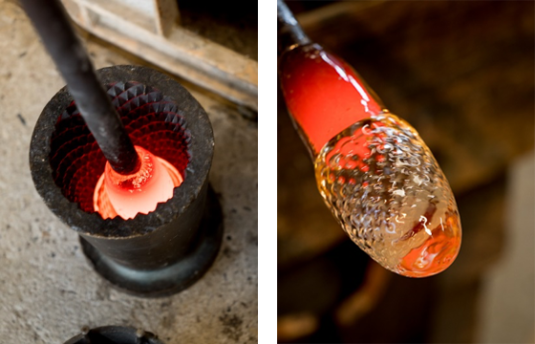 ぼくのように「気泡入り」を作る場合は、まず、水飴状のガラスの塊を小さなすり鉢のような金型に押し付ける。その金型の内側には細かい突起がたくさん付いているので、ガラスの表面には無数のくぼみが作られる。そして、さらにそのガラスの上に炉で溶けているガラスを巻きつけることで、内側に気泡を作れるのである。これがベネチアで500年もの間「門外不出」とされていた秘技なのだった。単純すぎて、ちょっと拍子抜けしそうだ。