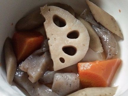 お煮しめは、田舎風に根菜を大ぶりに切り、だしを利かせて煮つけています。