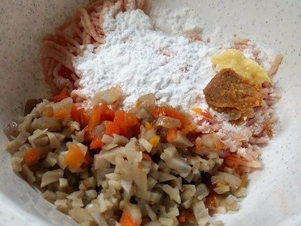 お煮しめを粗みじんに刻み、鶏ひき肉、片栗粉、しょうが、みそを混ぜ合わせます。