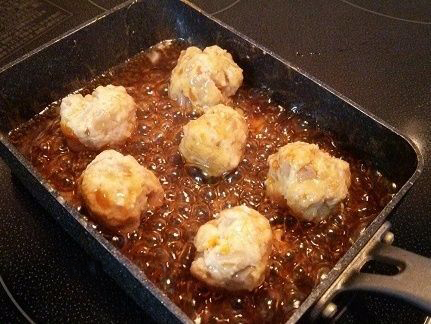 ★を混ぜ合わせてフライパンに入れ沸騰させて甘酢あんを作り、鶏だんごにからめます。仕上げに白ごまをふります。