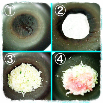 ③餃子の皮はすぐ焼けるので、ボウルに入れて混ぜておいた★をすぐに②の上に盛ります。