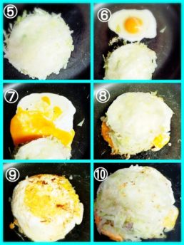 ⑧⑦の上に⑤をのせます。卵と餃子の皮で豚肉とキャベツを挟んでいる状態です。