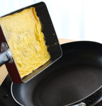 ★をよく混ぜ15×18㎝程度の薄焼き卵を作ります。薄焼き卵を破らず作るには、卵焼き器の隅までしっかり油を塗るのがポイントです(フッ素樹脂加工のものでも念のため塗ります)。ひっくり返す際に破れやすいので、上面は、ひと回り大きなフライパンに移して焼くとうまくできます。フライパンに移す前に、薄焼き卵の4辺をヘラなどで軽く動かしてきれいにはがれるようにしましょう。