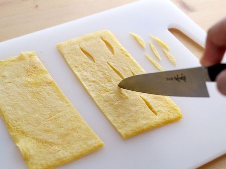 焼きあげた薄焼き卵の短いほうを半分に切り、鬼のパンツ柄になるよう包丁で細長く穴をあけます。