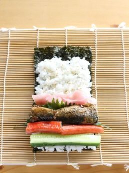 巻きすにのりを縦長に置きます。のりの向こう3㎝をあけて酢飯を広げ、白ごまを全体にふります。手前から順にきゅうり、かに風味かまぼこ、青じそ、いわしの蒲焼き、甘酢しょうがを置き、巻きすで巻きます。