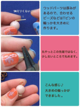ウッドパーツの厚さを考えて合わせるビーズにTピンで輪を