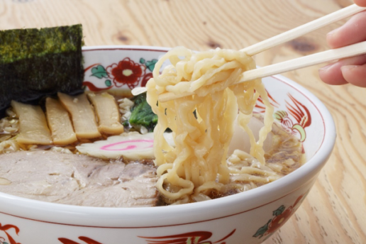 中太のちぢれ麺はもっちりとして、餅やうどんのように弾力がある。