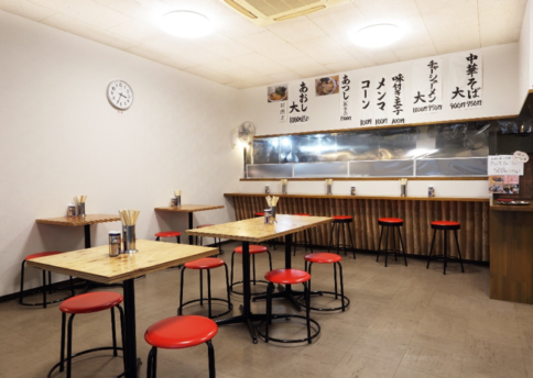 店内はシンプルで、赤い椅子が昔ながらのラーメン屋の風情を漂わせている。