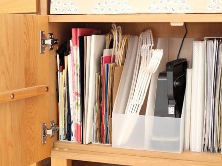 ついつい増えがちな紙袋やショップのビニール袋。わが家では、出かけるときにサッと使いやすいよう、リビング収納の一角に立てて収納していて、「ここに入るだけ」と量を決めて保管しています。