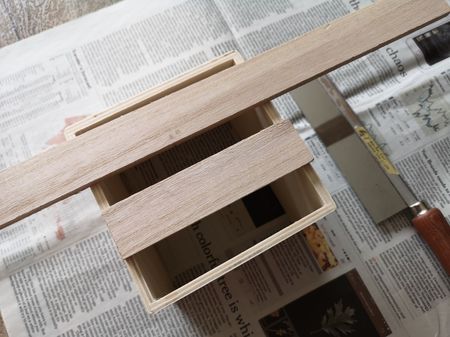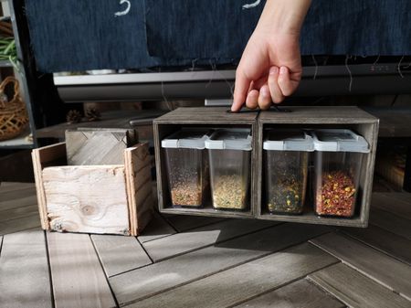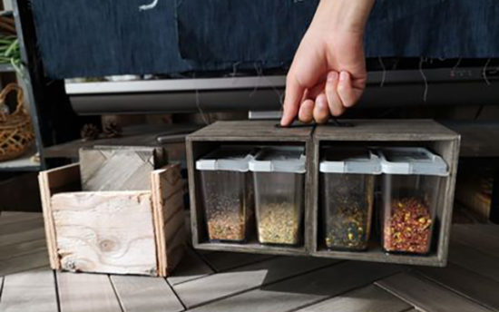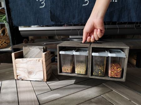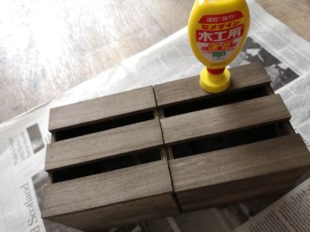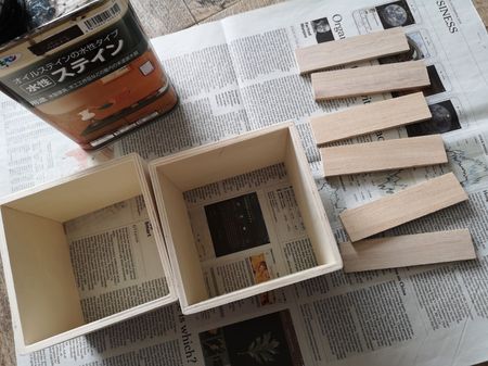 今回は調味料収納にしたので、反対側から落下しないように片面をふさぎます。すのこを解体し、ボックスの幅の長さの板を6枚用意します。