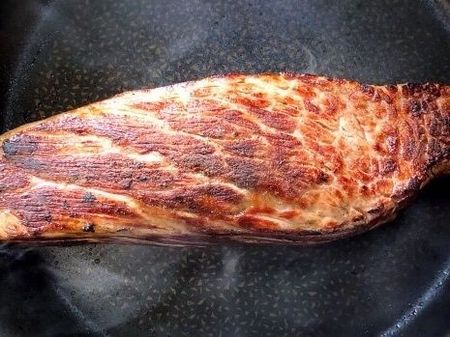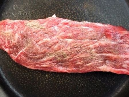 ②牛肉は焼く30分前に冷蔵庫から出しておきます。焼く寸前にこしょうをしっかりめにすり込み、強火で熱したフライパンで、返しながら各面を1〜2分ずつ焼きます(多少焦げるくらいに焼くと◎。側面も忘れずに!)。