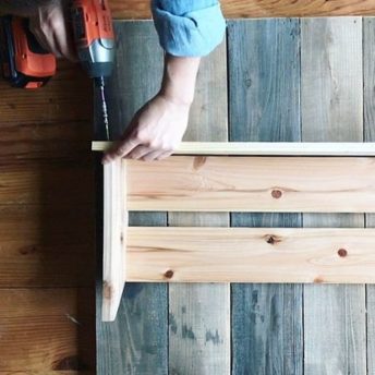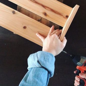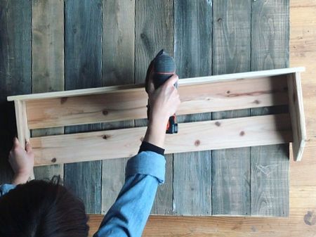 ②斜めにカットした側板と背の部分になる板をビスで固定します。背板は上下2枚取りつけます。