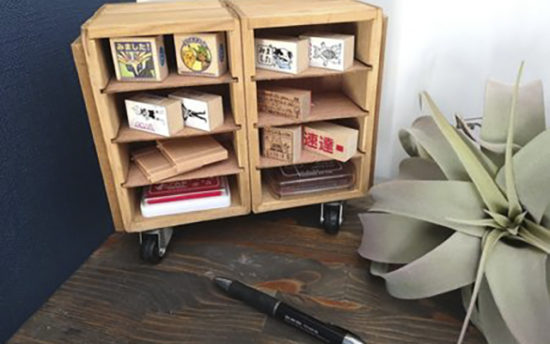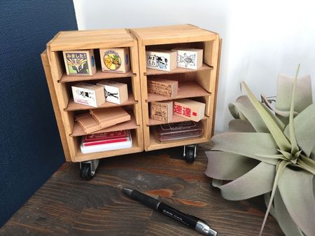 寝室に、アトリエとまではいかないけれど、机があります。机の上にスタンプを置きたい。ただ置くだけではなく使いやすく収納したいと考え、100円ショップで売っている材料で収納ケースを作れないかと試行錯誤しました。けっこう使いやすいです。よかったら読んでみてください。