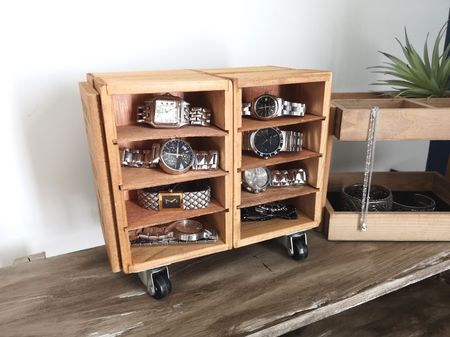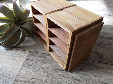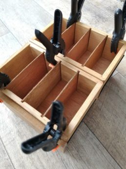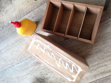 木製仕切りケースの側面に木工用ボンドをつけ、ケース同士を貼りつけます。側面をはりつけたものを2セット用意したら、それぞれの背面に木工用ボンドをつけ、貼りつけて固定します。