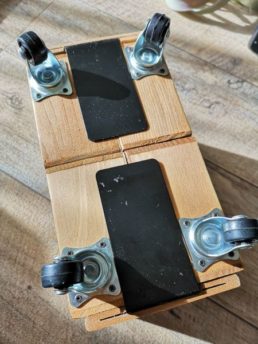 ドライバーとねじを使用し、ケース底面の四つ角にキャスターをつけます。